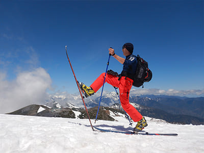 板に刻まれたウロコ模様により平地はもちろん緩斜面も直登でき、踵が上がることにより歩くのも快適。そして何よりゲレンデスキーよりもはるかに軽いので、自由度・軽快性・機動性は桁違いです!最近ではヘビークロカンとも呼ばれ、幅広でエッジも付いており滑りに寄せた作りになっていて、熟達すればターンも可能です。